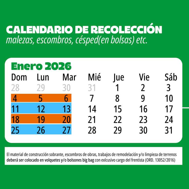 Es importante también que tenga en cuenta que el material de construcción sobrante, trabajos de remodelación y/o limpieza de terrenos, deberá ser colocado en volqiuetes y/o bolsones big bag con exclusivo cargo del frentista; esto, establecido por la ordenanza 1305/2016.